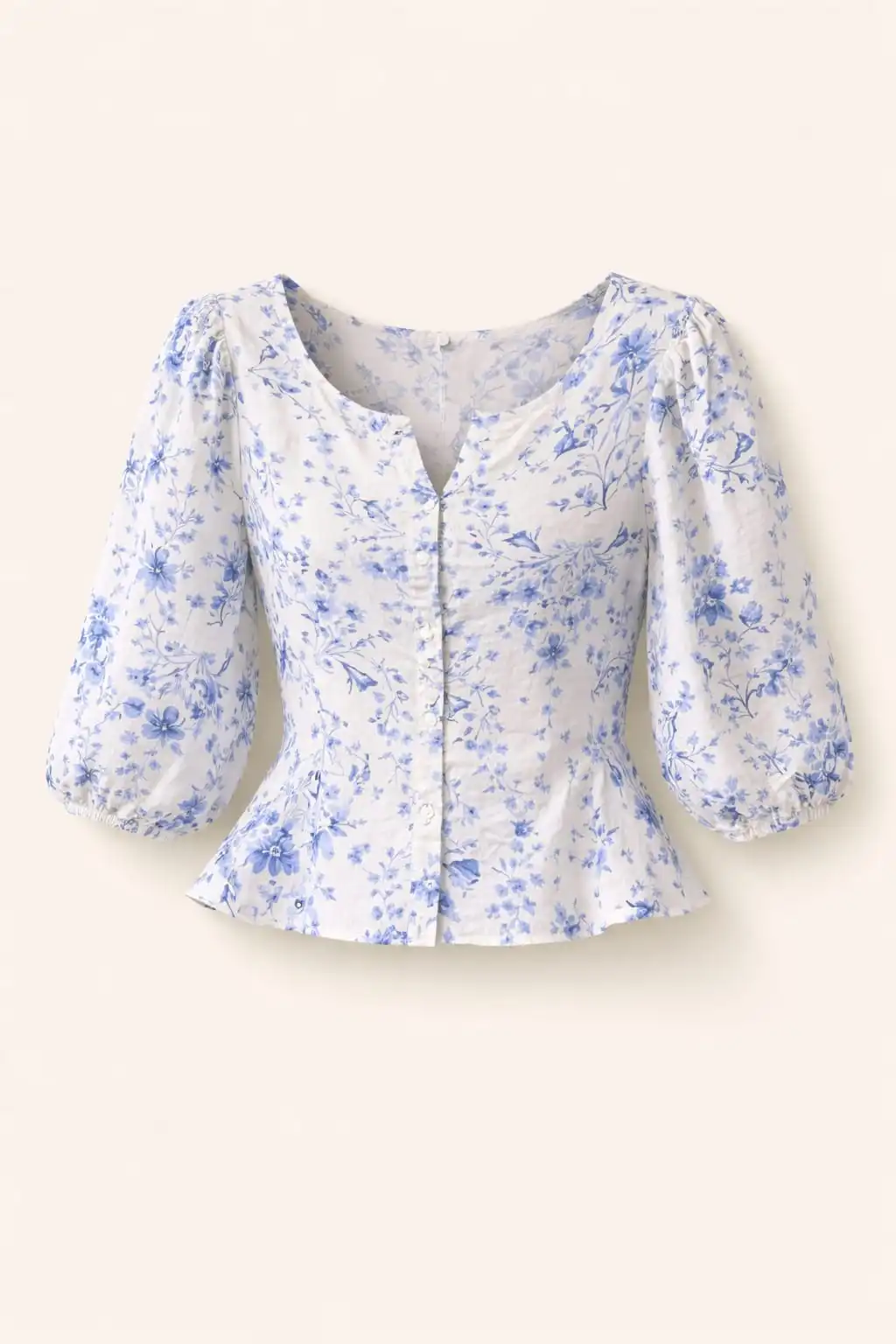Fresh Blue Floral Linen Blend Blouse for Everyday Elegance